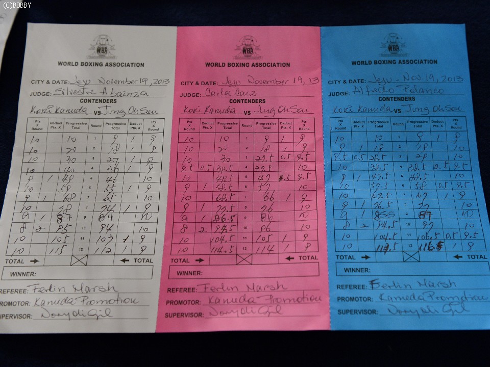 19日、韓国の済州島で行われたWBA世界バンタム級タイトルマッチ、王者の亀田興毅(27=亀田)対挑戦者同級14位、孫正五(ソン・ジョンオ、32=韓国)の12回戦の採点が判明した。