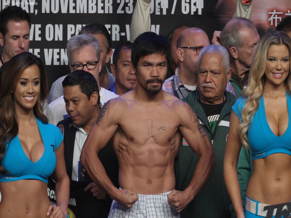 これが昨年12月以来のリングとなるパッキャオは145.0ポンド(約65.7キロ)、元WBA世界ライト級王者リオスは自己最重量の146.5ポンド(約66.4キロ)だった。試合はWBOインターナショナル・ウェルター級王座決定戦として12回戦で行われる。オッズは依然として5対1でパッキャオ有利と出ている。リオス勝利の配当は4倍となっている。