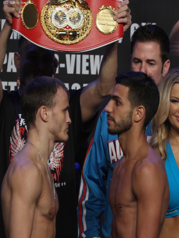 アンダーカードではIBF世界フェザー級タイトルマッチが行われる。計量では王者イフゲニー・グラドビッチ(27=露/米)が125.7ポンド(約57.0キロ)の1回でパス。前王者のディブは最初の計量では0.5ポンド(約220グラム)オーバーだったが、2度目の計量では全裸で秤に載り、リミットちょうどの126.0ポンド(約57.1キロ)でクリアした。今年3月以来の再戦だが、オッズは3対1でグラドビッチ有利と出ている。