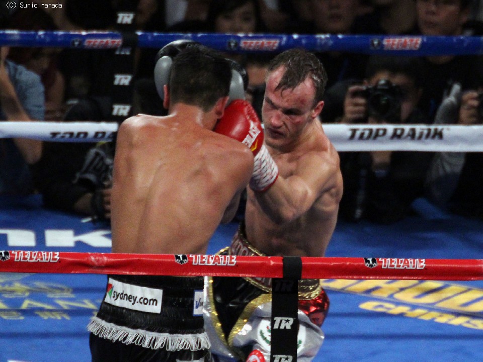 ともにファイター型だが、手数で勝負するタイプといえる。どちらが相手を下がらせるかという点が序盤の焦点だったが、圧力で上回ったのは王者だった。前傾姿勢で前に出るグラドビッチ、後手に回りながら機をみて応戦するディブ。まずはグラドビッチが主導権を握ったが、4回にはディブも反撃して前半を終えた。