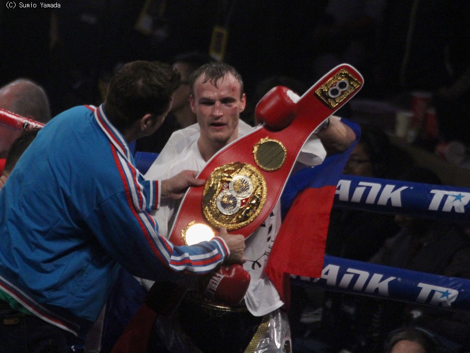 試合が大きく動いたのは6回のこと。グラドビッチの右が浅く入り、ディブがバランスを崩してダウンを喫したのだ。勢いづいた王者は7回、積極的に挑戦者を追い立ててリードを広げた。8回、ディブは左構えにスイッチしたが、逆にグラドビッチの左を浴びて窮地に陥るなど傷口を広げる結果となった。9回、グラドビッチが右アッパーから右フックをヒットするとディブのセコンドが棄権の合図を送り試合は終わった。