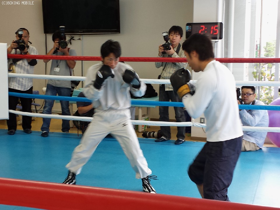 対戦相手のヘルソン・マンシオ(比)を「接近戦になるとしぶといと思うので、ならないように中盤でKOしたい」と分析する尚弥は、10月に日本ミニマム級王座を返上した原隆二(大橋)と3ラウンドのスパーリングを行った。徐々にヒートアップする両者は、迫力の打合いを披露し、仕上がりの良さをアピールした。