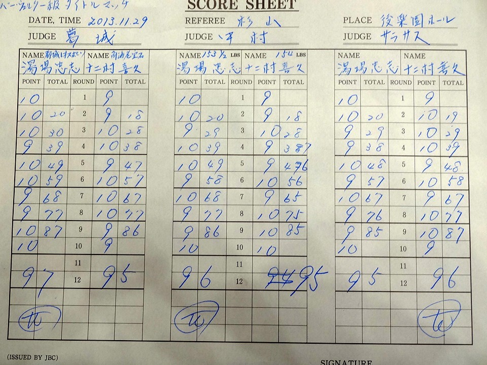 試合は、低い姿勢で飛び込む十二村に対し、サウスポーの湯場はやはり懐が深く、追う十二村、迎え撃つ湯場の展開が続いた。両者が踏み込んでは頭が当たる場面も多く、試合は度々中断。7Rには十二村が右頬から出血、またクリンチやもつれ合いもあって試合は荒れた。