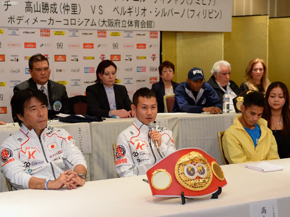 4年5ヶ月ぶりの国内試合となるIBF世界ミニマム級チャンピオン高山勝成(30=仲里)が、挑戦者で同級6位ベルギリオ・シルバーノ(比)をむかえての初防衛戦の調印式が1日、大阪市内のホテル行われた。