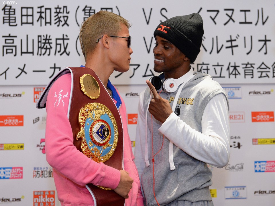 WBO世界バンタム級タイトルマッチ、初防衛戦に臨むチャンピオン亀田和毅(22=亀田)と挑戦者で同級6位のイマヌエル・ナイジャラ(28=ナミビア)の調印式が1日、大阪市内のホテルであった。
