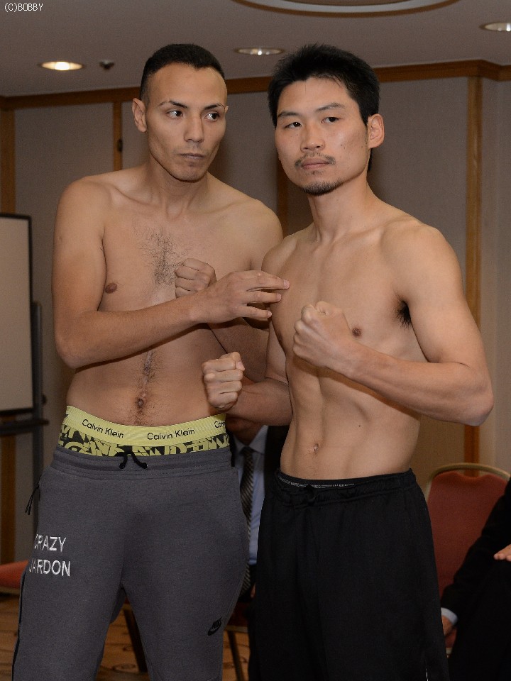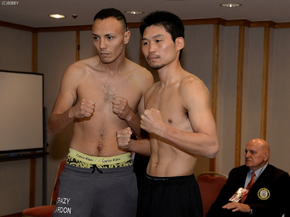 昨日の調印式の一色触発ムードとは一転、両者は目を合わせることなく淡々と計量に臨み、ともにスーパーフェザー級リミット58.9kgを丁度でクリア。写真撮影では、ハルドンが王者の三浦にカメラの方向を示すなど気を遣う場面もあった。