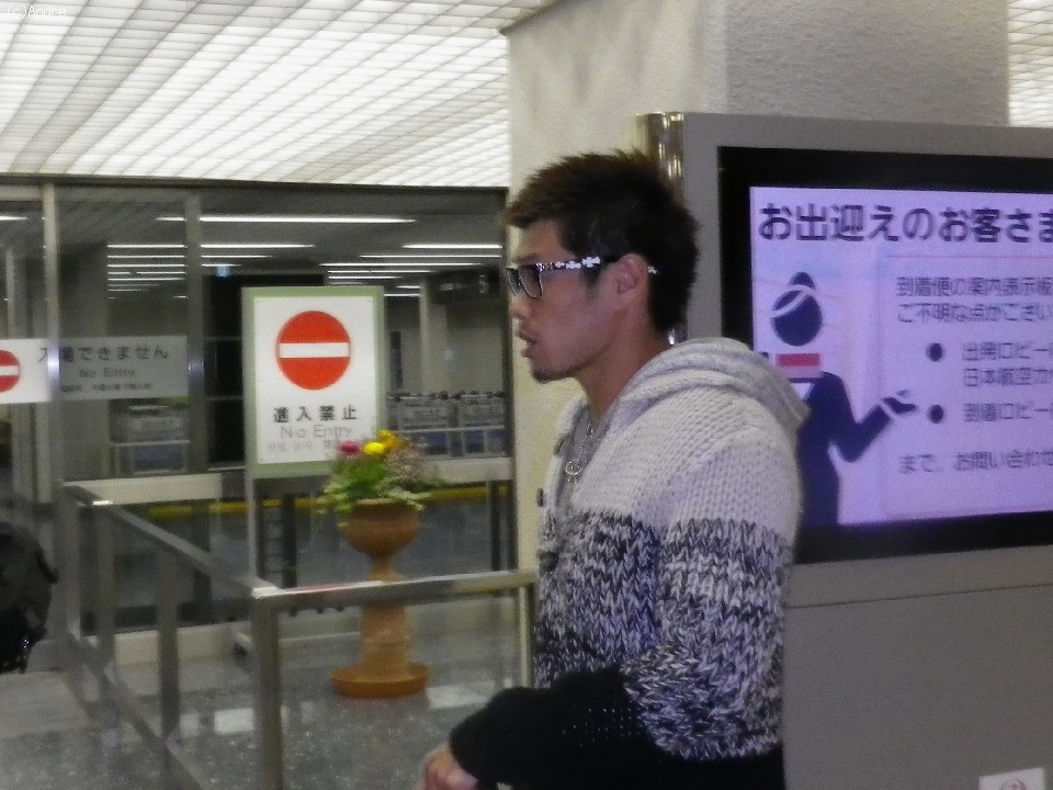 22日、夜の便で合宿先の沖永良部島から元気な姿で帰阪した長谷川穂積(33=真正)は空港到着ロビーで集まった報道陣に会見を開いた。
