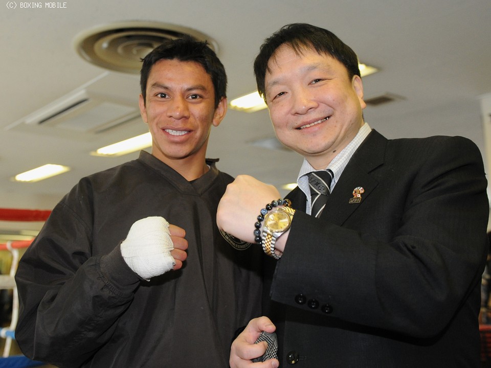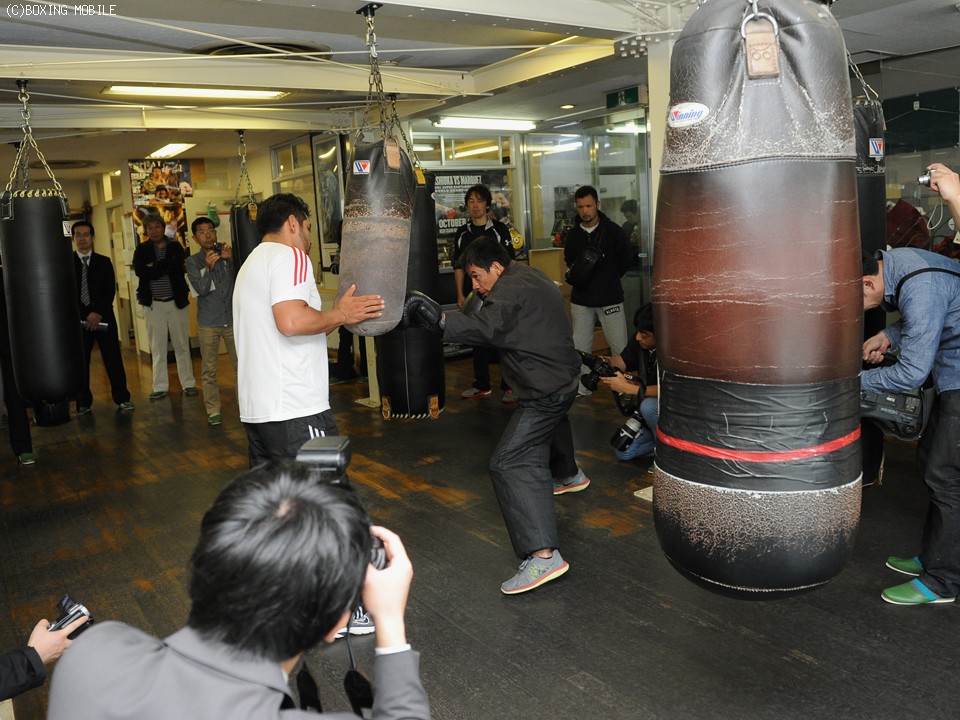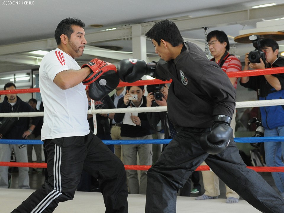 練習では10オンスグローブをはめてミット打ちを行い、コンビネーションも豊富でバランスの良さを感じさせた。また、その場で20回転ほどしてすぐにミットに向かう変わったトレーニング法も披露。松本好二トレーナーは「ダメージを受けた状態でいかにパンチが出せるか、アマではたまにある練習」と説明。「足元がしっかりした、メキシコ人特有の選手。でも八重樫なら対応できる」と八重樫の勝利を確信。大橋秀行会長も「中身の濃い練習をきっちりとやったね。強敵だがキャリアのある八重樫ならなんとかしてくれると思う」と期待を寄せた。