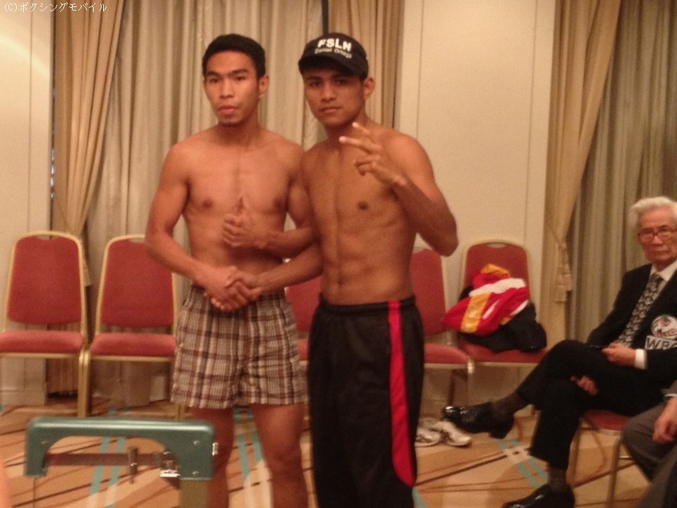 計量を難なくクリアするとニカラグアと日本の国旗を振りながら記念撮影に応じた軽量級のスーパースター、ロマゴン。コンディションはー、の問いにVサインで答えた。
