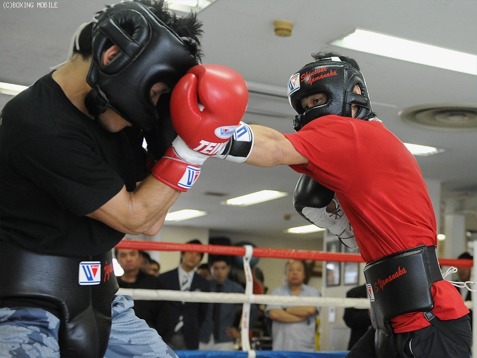 同門の佐々木洵樹との2ラウンドのスパーリングは、間合いやタイミングを図ることを中心にした軽めのものだったが、折々で左ストレートを繰り出して感触を確かめている様子だった。大和心トレーナーからは「右でコントロール」という指示が飛んでいた。手合わせを終えた佐々木は「山中さんの左はタイミングが掴めないんです。こちらが出て行ったら合わせられるし、行かなかったら打ち込まれてしまう。そのうえいろいろな角度から飛んでくるし、フェイントをかけて打ってくるのでパンチが上(顔面)にくるのか下(ボディ)にくるのかも分からないんです」とお手上げといった様子だった。