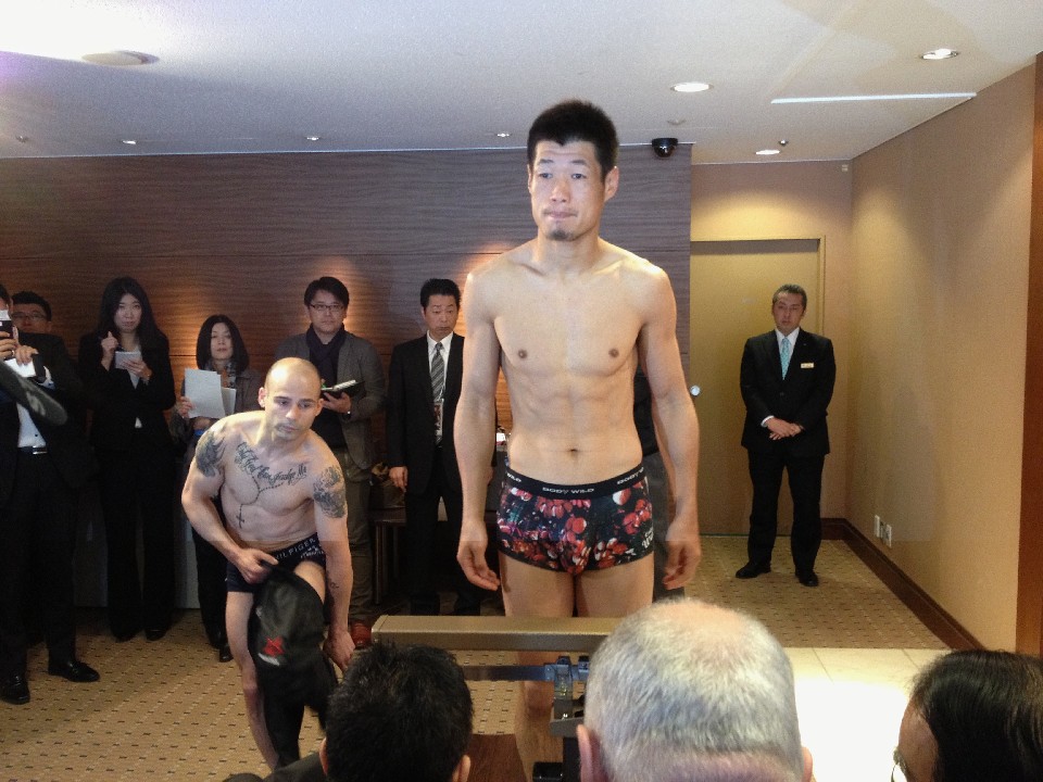 当日計量の結果は、チャンピオンのキコ・マルチネス(スペイン)が59.1kg。チャレンジャーの長谷川穂積は59.2kg。