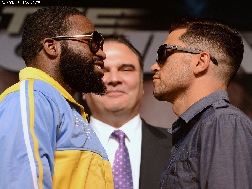 メインの2試合前には「メイウェザーの後継者」と目される前WBA世界ウェルター級王者のエイドリアン・ブローナー(米)が登場する。5ヵ月前、2度のダウンを喫してマイダナに敗れているブローナーは「神に感謝します…」と、まずは殊勝なコメントで会見をスタート。しかし、その矢先に「1度負けたからといって心を入れ替えたのかと思ったら大間違いさ。今回は相手を破壊するために来たんだ。カルロス・モリナ? そんな相手をぶつけるなんて俺に失礼じゃないか。彼は過去最高額の報酬をもらうらしいが、俺にボコボコにされるよ」と、まくしたて記者の笑いを誘った。これに対しモリナは「この戦いにすべてをかけている。打ち合うので楽しみにしていてほしい」と短く返しただけだった。
