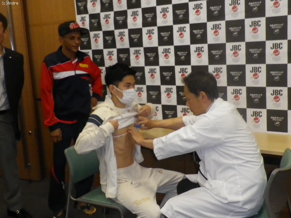 検診を終えた井岡は「ここまで順調にきていると思います。体重も問題ありませんし、フライ級の体にシッカリ仕上がった」と自信をみせた。リーチ差9cmと聞いた井岡は「相手はリーチが長いのもわかっていたし対策も練習も充分積んできたので全く問題ありません」とリーチ差のハンデにも意に介さない様子で語った。6年ぶりの対面には「とくに6年前と変わらないですよ」と笑顔をみせ会見を終えた。
