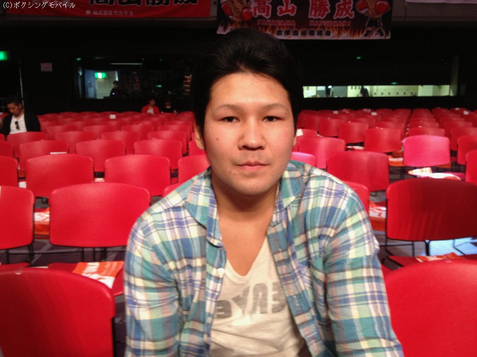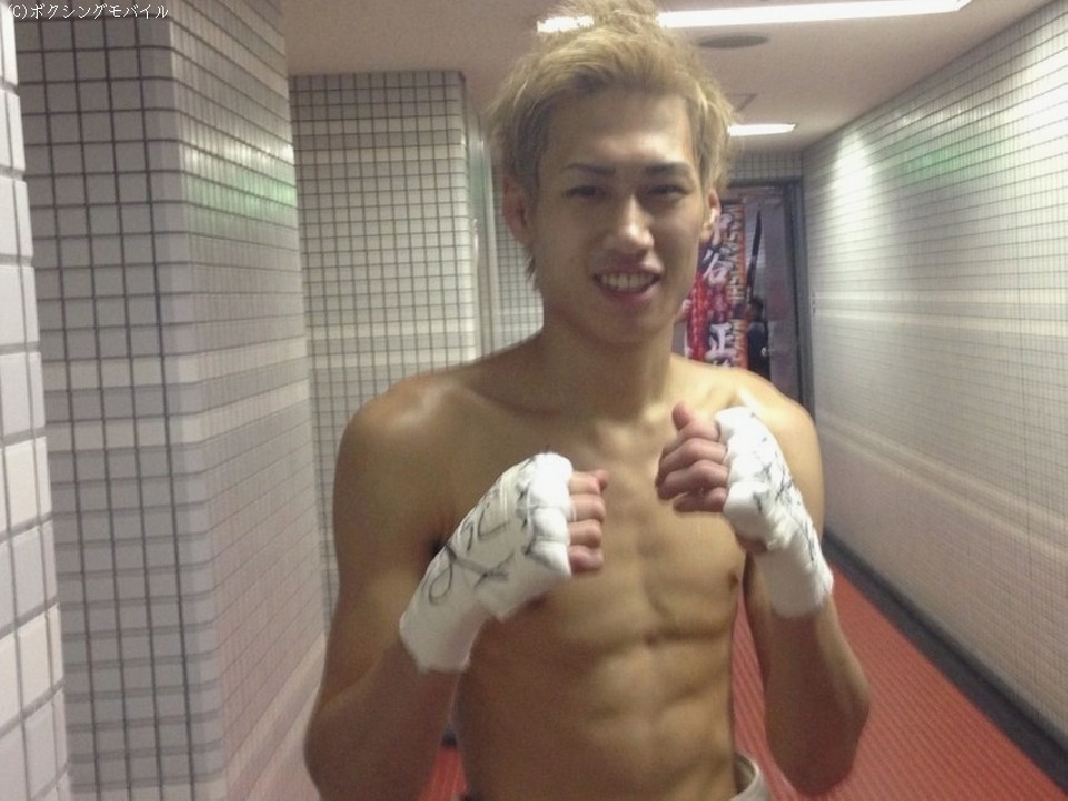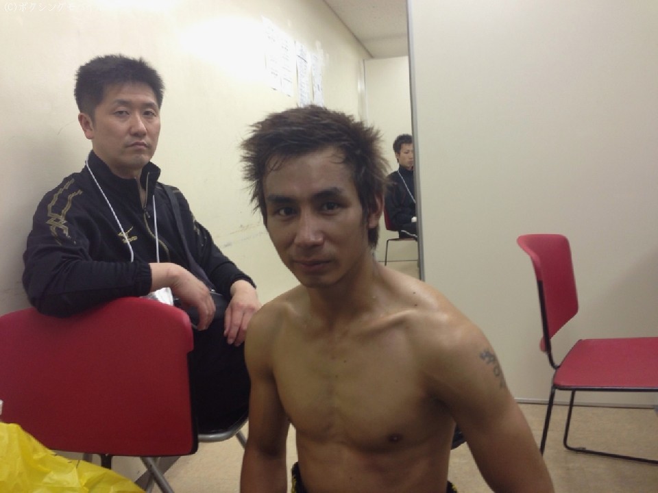 右ストレート一発で試合を決めた石田。リングサイドで試合を見つめたスーパーフライ級日本王者、戸部洋平(三迫)は「早く終わったので…上手いですね」と、急な取材に照れ笑いした。