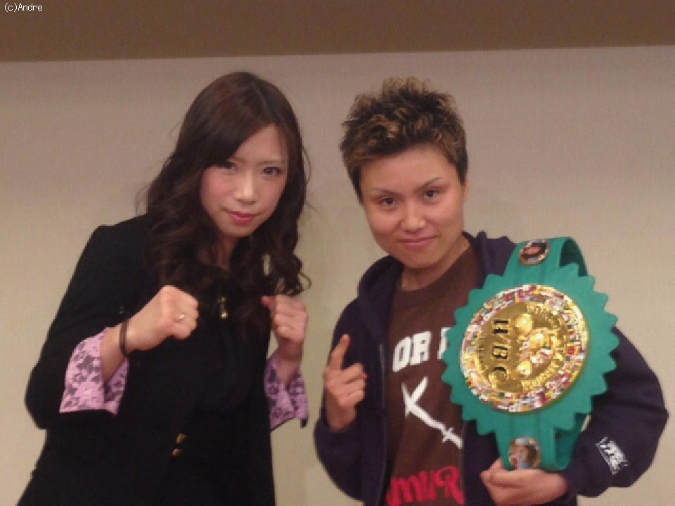調印ならびにグローブチェックを無事に済ませて会見にのぞんだ王者・安藤は「初防衛戦を日本でできることを関係者の皆様に感謝します。この試合の目標は、練習してきたことをすべて出すことです。それに、ボクシングを始める前から憧れていた池山さんと同じリングに上がれることを誇りに思っています。池山さんがチャンピオンになって最後は私が試合を締めくくりたいと思います」と女子最年長の池山に敬意をはらった。