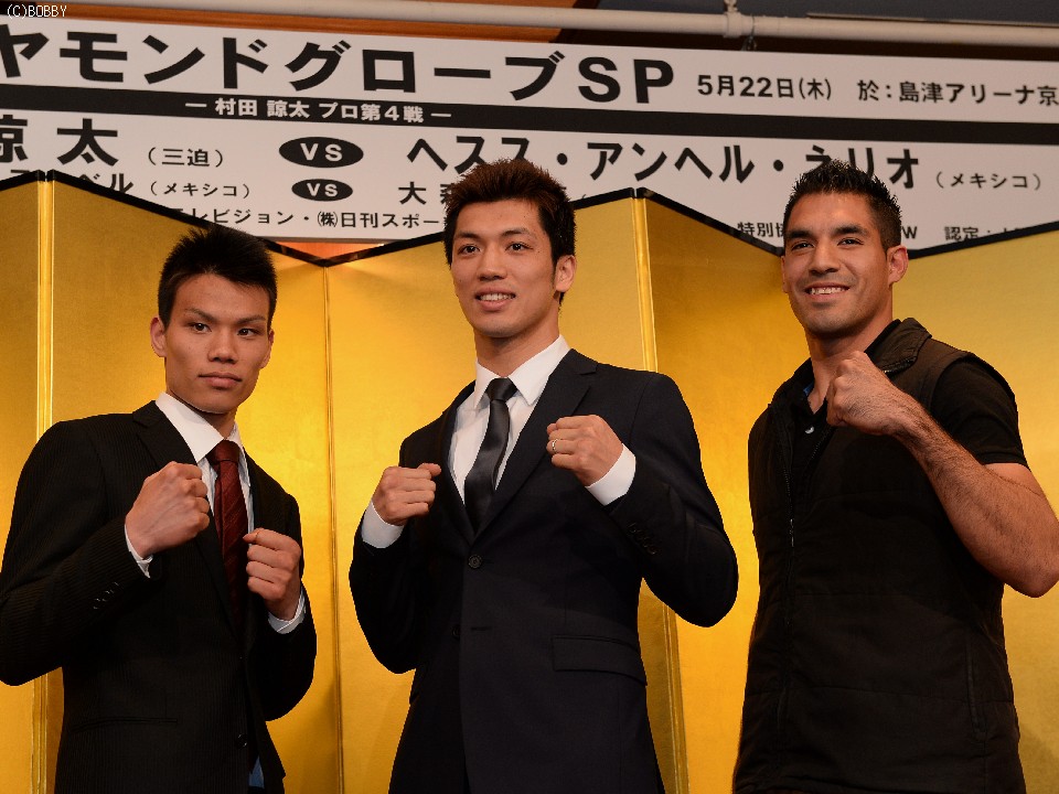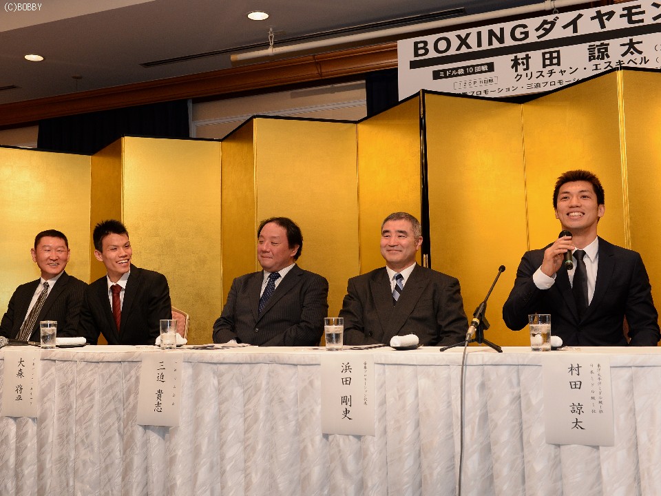 また、この日はセミファイナルを務める村田の南京都(現京都廣学館)高校の後輩、12年のバンタム級新人王、大森将平(21=ウォズ)も登壇し意気込みを語った。
