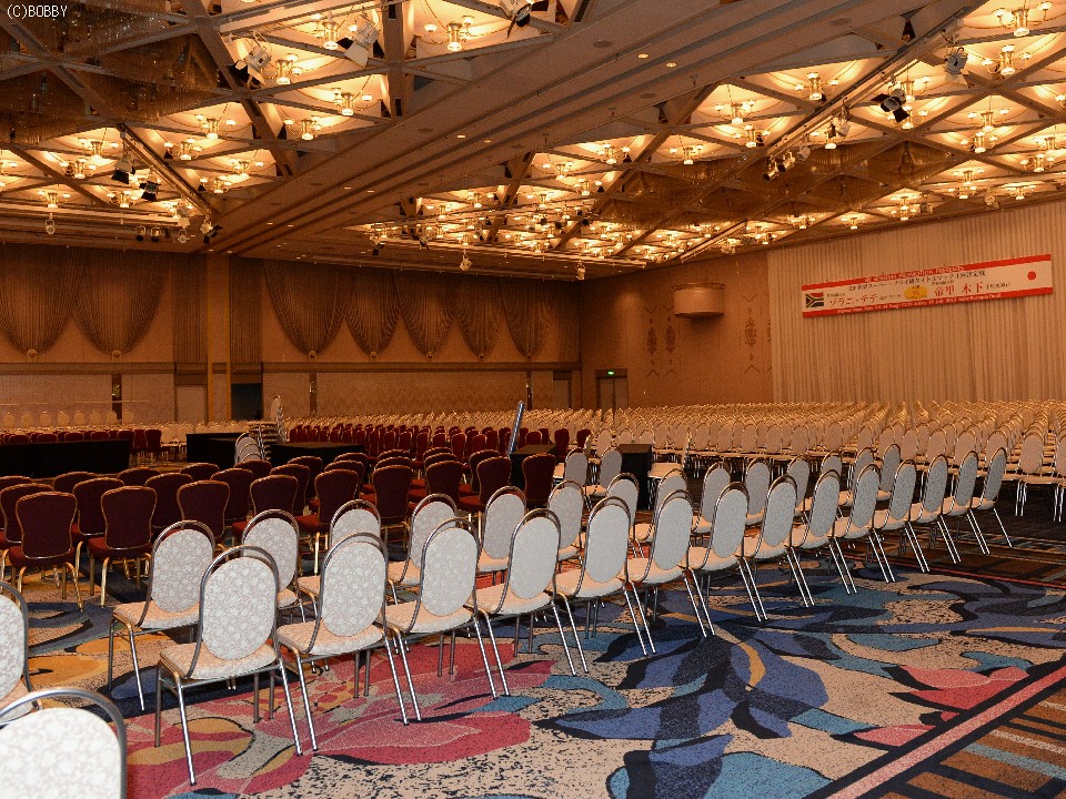 今夜の決戦場となる神戸ポートピアホテル大輪田の間は、座席数1700人で立ち見込みだと2000人収容の壮観な会場。ただいま設営の最中だ。