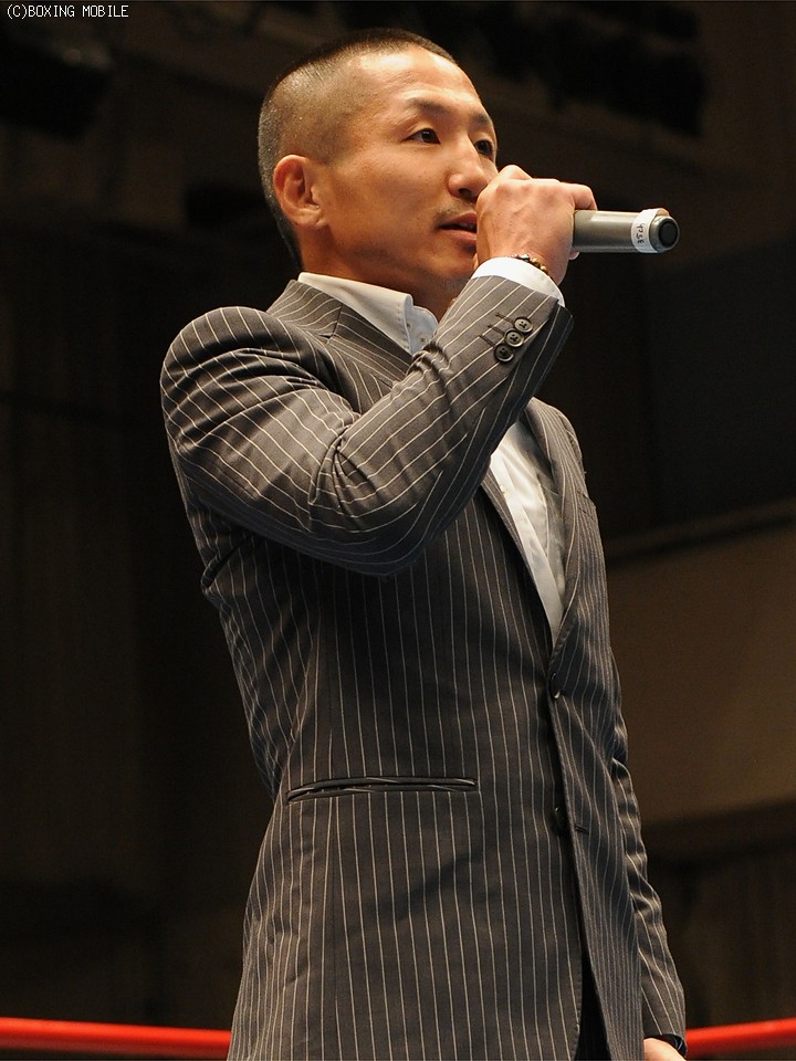 18日、後楽園ホールで予定されていた日本スーパーバンタム級タイトルマッチは、王者・大竹秀典(33=金子)の練習中の怪我により延期となり、大竹はスーツ姿でこの日のリングに立ち、対戦相手の日本同級6位の古橋岳也(26=川崎新田)と関係者、そして試合を待ち望んでいたファンに向け謝罪した。