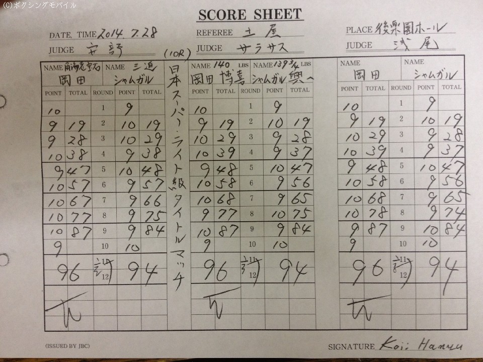 しかし判定は、シャムガルの予想以上の善戦も岡田が3者ともの96-94で逃げ切りに成功。初防衛に成功した。