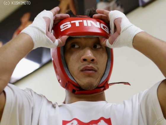 ■スパーリングを見させてもらいましたが、他の選手ではあまり見ない、アマチュアで高校生が使用しているヘッドギアをつけているのが印象的でした。