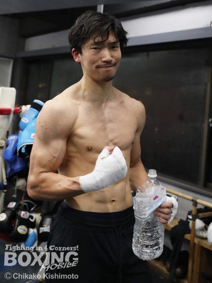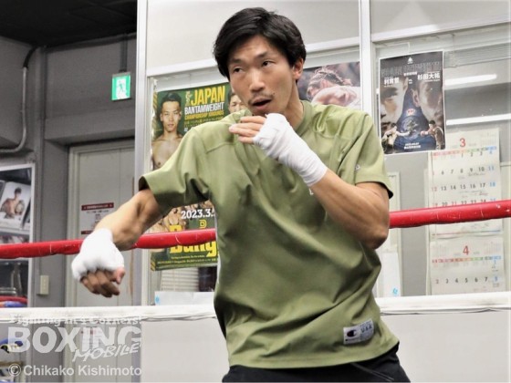 伯耆トレーナーが持つミットにキレ味抜群のパンチを叩き込み絶好調をアピール。中間距離から打ち込む見えづらい角度の左は大きな武器になる。4月26日、いぶし銀のサウスポーが、大輪の花を咲かせる!