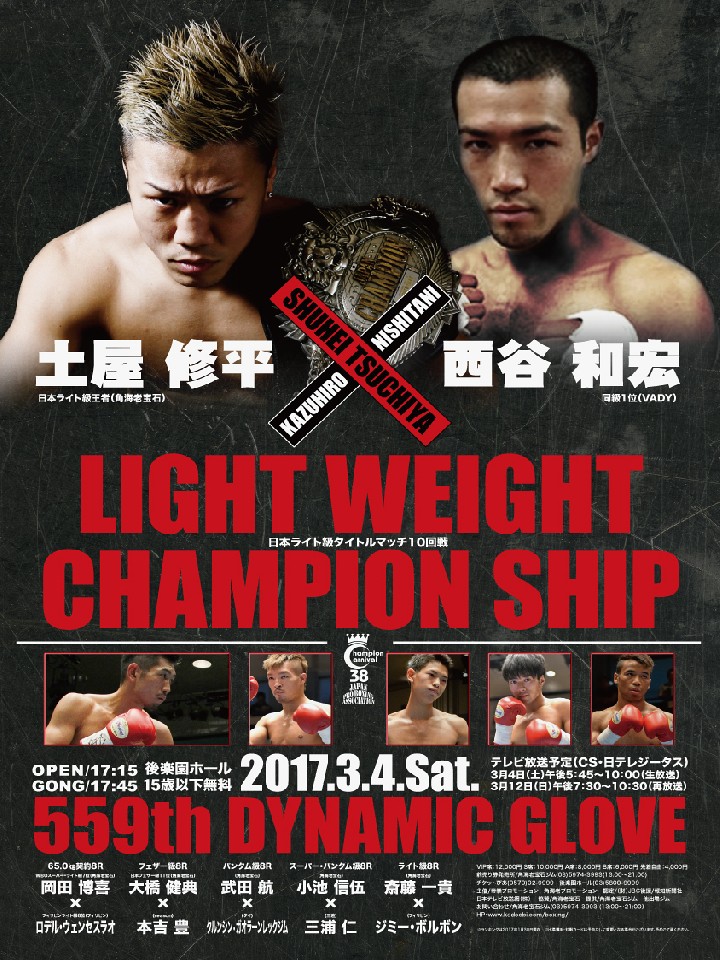 注目:デビューから7年半かけて手に入れた日本タイトルの初防衛戦を迎える土屋修平(角海老宝石)。挑戦者の西谷は直近5試合を2勝2敗1分と実力を出しきれていない。タイトル挑戦が一皮むけるチャンス!