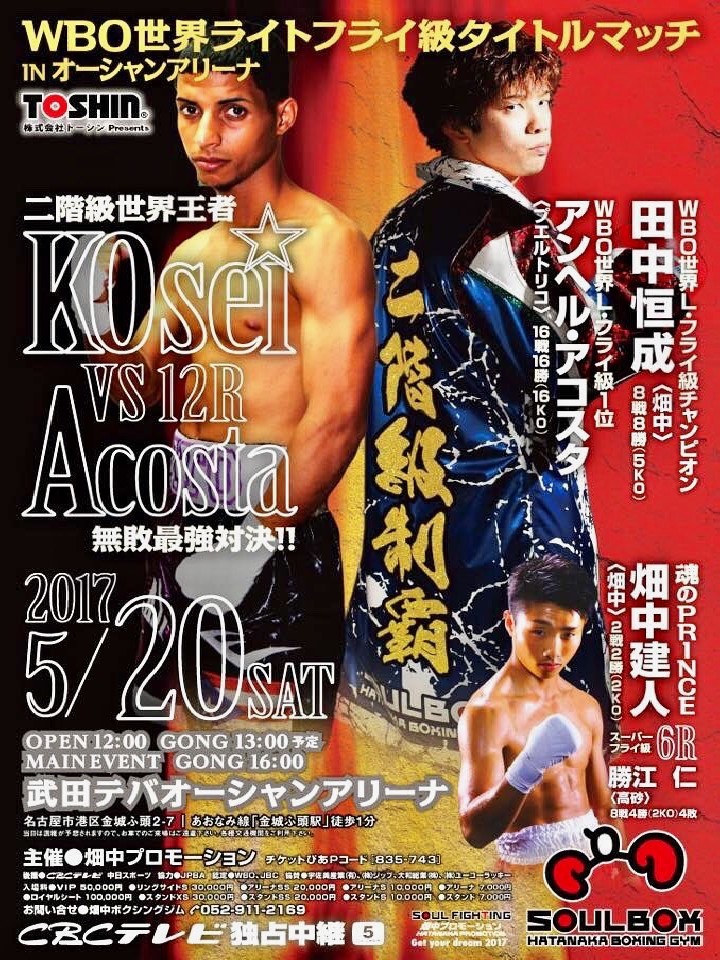 注目:2階級制覇王者の田中の初防衛戦は、16戦全勝16KOの戦績を誇るアコスタとの指名試合。厳しい戦いは予想されるが、ここをクリアすれば日本人同士による統一戦も見えてくる。