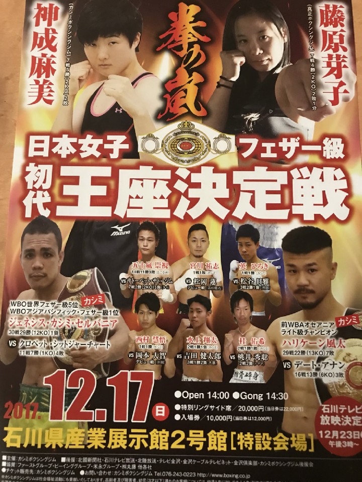 注目:直近3連勝中の藤原が敵地金沢に乗り込んで初代日本王者を目指す。迎え撃つのは2連勝中でプロ戦績7戦5勝(2KO)2敗(1KO)の神成。序盤から激しい打ち合いが予想される。