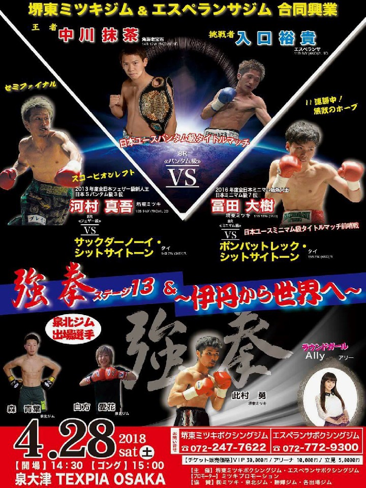 注目:開催されたほぼ全階級の日本ユース初代王者が日本ランキング入りを果たす中で、激戦階級が故にランカー入りを見送られたバンタム級の中川抹茶が敵地大阪に乗り込んで、日本ランキング14位の入口裕貴と対決する。一方、スーパーバンタム級で日本ユースタイトル奪取を狙うも初代チャンピオン水野拓哉(松田)に阻まれ、ベルトに手が届かなかった入口は初戴冠に挑む。この両者は、それぞれが欲しいモノを相手が持っている状態。相手が狙うモノを手見上げに、いざ、ゴング! 前日計量で入口が失格。試合は中止。