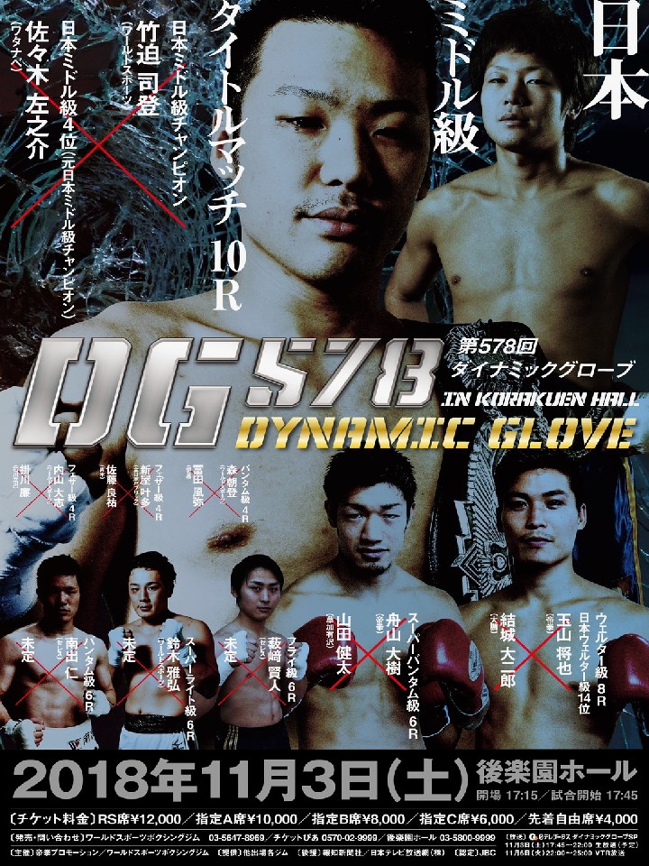 9戦9勝9KOの記録を誇る竹迫の初防衛戦。3月のチャンピオンカーニバルでは王者の西田光(川崎新田)を92秒で仕留め、8戦目でのタイトル獲得に成功した。これだけの破壊力を持つ竹迫だけに、初防衛戦は試合が決まらず6月はノンタイトル戦を消化。今回、元王者の佐々木が名乗りを上げ、戴冠から8ヵ月が経ってようやく初防衛戦が決まった。元日本王者の佐々木はプロ9年目の右ファイターで、戦績は18戦12勝(6KO)6敗(4KO)。4連敗を喫し日本ランクからも外れたが、今年2月に4位の成田永生(八王子中屋)を3回TKOで破り復活。タイトルは今回で2度目の挑戦となる。良くも悪くも形振り構わない攻撃が信条で、竹迫相手にも怯むことなく仕掛けてくるはず。迫力のある打ち合いが期待できそうだ。