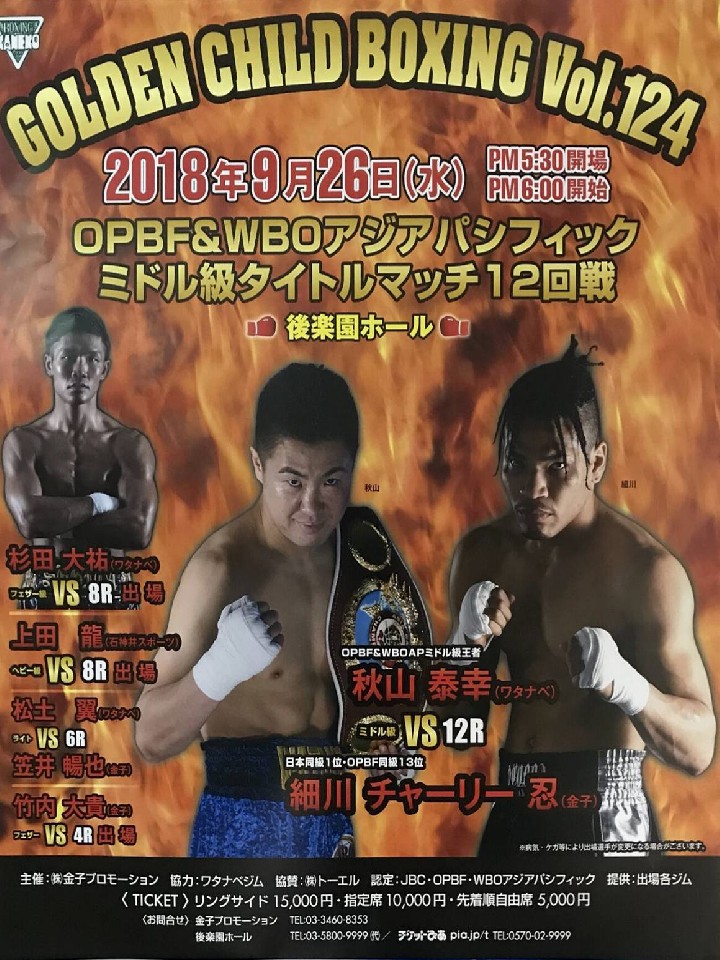 二人の対戦は今回が2度目で、昨年3月のノンタイトル戦は秋山が77-75,77-75,76-76と2-0の判定で辛勝したが実力は伯仲。互いにこの1年半でどれだけ成長したのかが問われる。ともに高いKO率を誇るだけに、今回は完全決着が期待される。