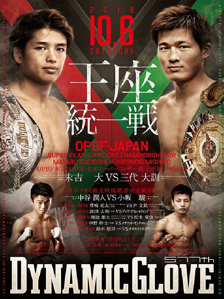 日本人同士による王座統一戦!今年2月に指名挑戦者の大里拳(大鵬)を、5月に1位の東上剛司(ドリーム)を退け2度の防衛に成功した末吉は、現在WBO7位にランク。この統一戦をステップにキャリア唯一の黒星をつけたWBO王者・伊藤雅雪(伴流)へのリベンジを狙う。一方、6月にキャリア6戦目でカルロ・マガレ(比)からOPBF王座を奪取した三代は、初防衛戦がいきなりの統一戦。マガレ戦は長身を活かしきることができず紙一重の内容だったが、アマチュアで鳴らした三代のセンスは確かなもの。ジムの期待を背負い、まずは国内最強を目指す!