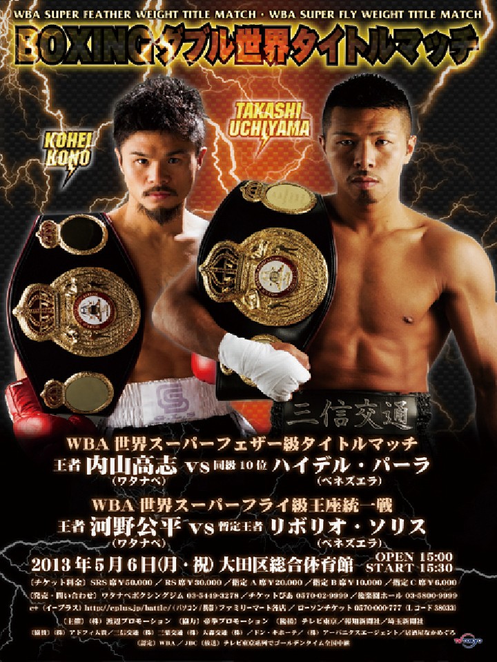 注目:王者・内山のV7戦。無敗の強豪を迎え撃つ内山だが、その拳に驕りは見られない。圧倒的な強さでベルトを守り、海外進出の本格準備に入りたい。一方、無敗の挑戦者ハイデル・パーラはタイトル奪取を狙うと同時に、兄のロレンソと共にベネズエラ初の兄弟世界王者誕生を目指し来日する。