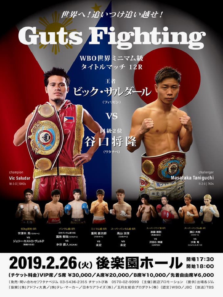 注目:昨年7月に神戸で前王者の山中竜也(真正)を判定で破り、2度目の挑戦で世界奪取に成功したサルダールに、昨年11月にWBOアジアパシフィック同級王座を獲得したばかりの谷口が挑む。これまで同期の京口紘人に先を行かれ悔しい想いをしてきた谷口は、昨年4月に左手甲の関節を脱臼する不運にも見舞われ、全治までに半年間を費やした。それでも腐らずに精進を重ね、昨年11月に3度目のタイトル挑戦で念願のベルトを巻いた。元々は京口以上のテクニックを持つサウスポーの谷口は、怪我の時期に徹底的に走り込むなど精神面でも大きく成長しただけに、今回の挑戦はタイミング的にもベストと言えるはずだ。