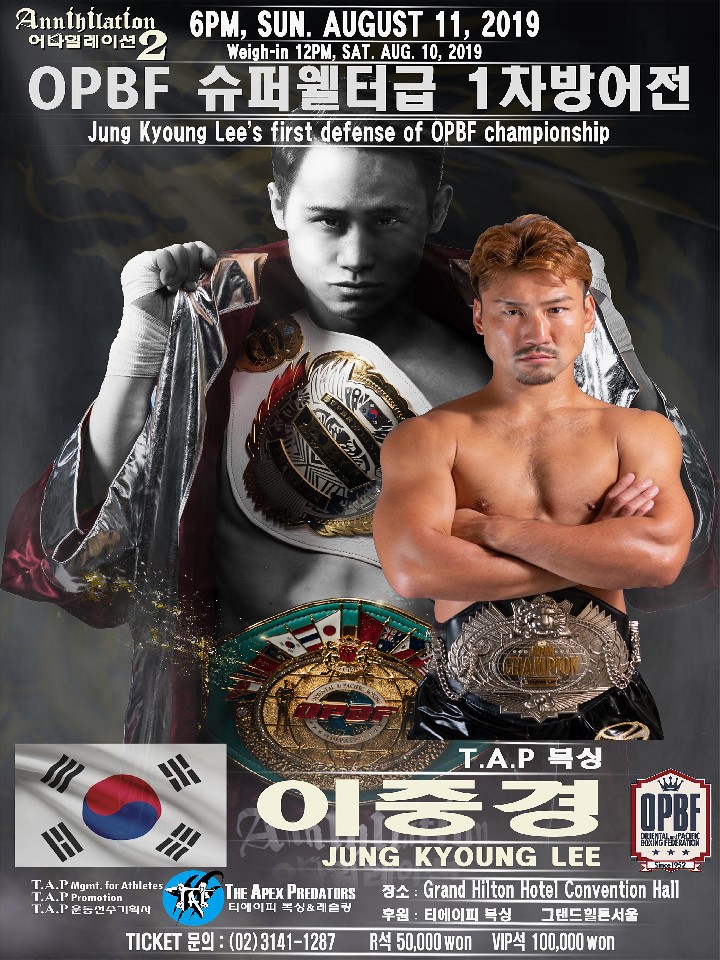 注目:渡部が日本同級暫定王座を返上し、11年4月に獲得したウェルター級に続くOPBF2階級制覇に挑む。王者は今年1月に空位のOPBF王座を獲得した戦績10戦7勝(3KO)2敗1分のリー。キャリアは浅いがここ4連勝と勢いのあるサウスポー。新藤に続きサウスポー同士の対戦となった渡部だが、5年半前にも韓国でPABA王座を獲得するなど45戦の経験値と圧倒的フィジカルを発揮できれば攻略は難しくはないはずだ。