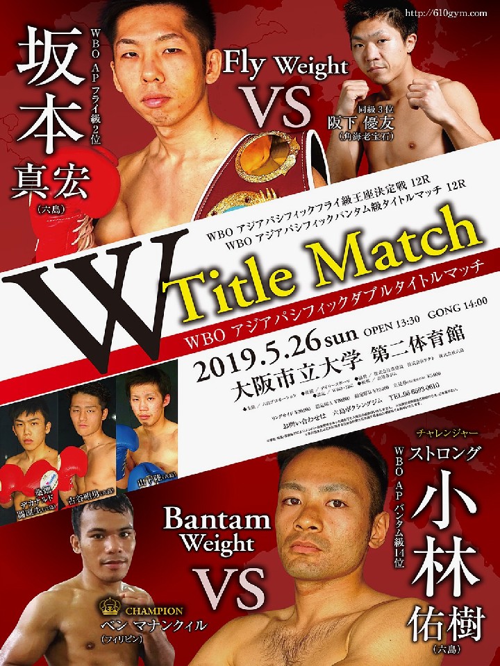 注目:昨年12月にOPBF王座決定戦に出場しダウンを奪われながらも奮闘した小林が、ターゲットを変えてWBOアジアパシフィック王座に挑む。王者のマナンクィルは2月に清瀬天太(姫路木下)に判定勝ちしこれが初防衛戦となる。小林は強い気持ちを持ち、序盤からボディで体力を削り後半勝負に持ち込みたい。不屈の精神で立ち上がった小林がベルトと世界ランクを奪いに行く!