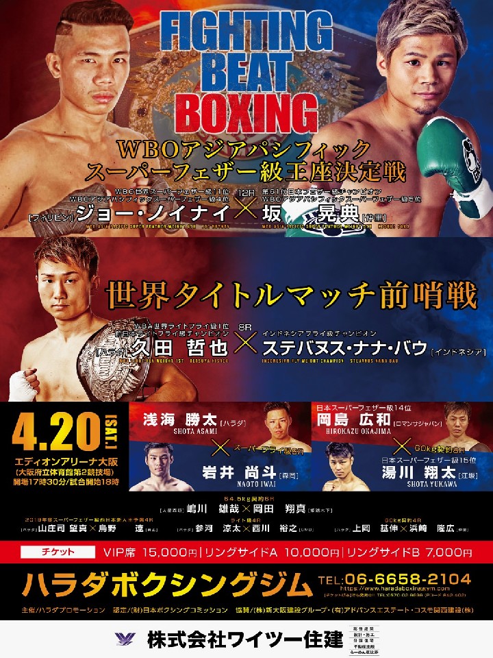 注目:元日本フェザー級王者の坂が1階級上げて地域王座戦に出場する。昨年は2戦とも2ラウンドで試合を終わらせ、復調の兆しを見せている坂。相手のノイナイは19戦16勝(5KO)2敗1分で2敗は前WBOアジアパシフィック・フェザー級王者のリチャード・プミクピック(比)、IBF世界フェザー級4位の阿部麗也(KG大和)に判定負けしたものだ。難敵を迎えた坂の序盤の出方に注目したい。
