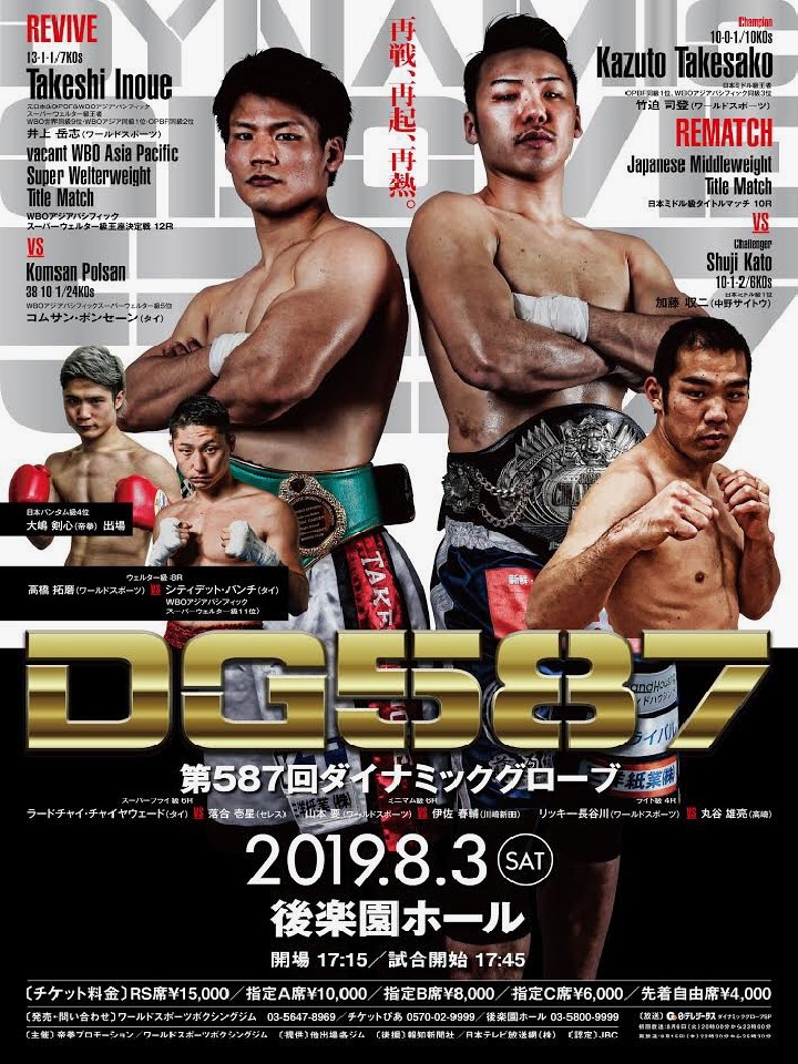 注目: 3月に三者三様の引き分けた名勝負のダイレクトリターンマッチ。タイトル初挑戦のサスウポー加藤が絶えずポジションを変えながら、竹迫を翻弄し前半ポイントでリードするも、後半は竹迫がプレスを強めて猛追しドローに持ち込んだ。絶対王者とされていた竹迫は、サウスポー加藤の予想を覆すファイトに苦しみ、2度目の防衛を果たすも10戦全勝10KOのパーフェクトレコードがストップした。一方、結果には結びつかなかったが、竹迫対策を活かした加藤は3月度の月間敢闘賞に選出されるなど高く評価を上げ、試合後には「次にやれば勝つ自信はある」と再戦を希望していた。5ヶ月という短い期間でどれだけ修正してくるのか?前戦を上お互いに回る好試合が期待される。