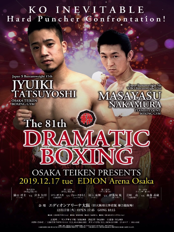 注目:無敗記録を続けている辰吉が13戦目で上位ランカーと対戦する。ここ数戦、急成長を遂げている辰吉は、勝って日本タイトル挑戦資格のある12位以内に食い込みたい。中村は今年4月に3年ぶりに復帰すると、高橋竜也(ヤマグチ土浦)を破り日本ランキング入りを果たした。両者とも好戦的なハードパンチャーなだけに序盤からバチバチの打ち合いが見られるだろう。
