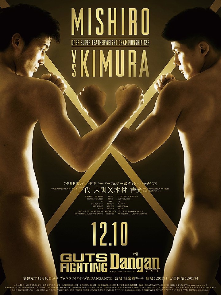 注目:日本人挑戦者を次々と撃破し防衛ロードを歩んでいる三代の4度目の防衛戦。相手は元日本ユース同級王者の木村。三代は、フィジカルの強さと抜群の距離感を武器に安定感のある戦いを見せる。7月の試合では、パンチの的確さも上がりまさに今が伸び盛りだ。木村は、昨年4月にWBOアジアパシフィック王座に挑戦するも敗退。しかし、7月に三瓶数馬に5回TKO勝ちしユーズ王座を獲得した。被弾は多いものの、気持ちの強さとパンチ力には定評がある。同じペースで力を発揮することができる三代に対し、序盤の先制攻撃は必須と言える。