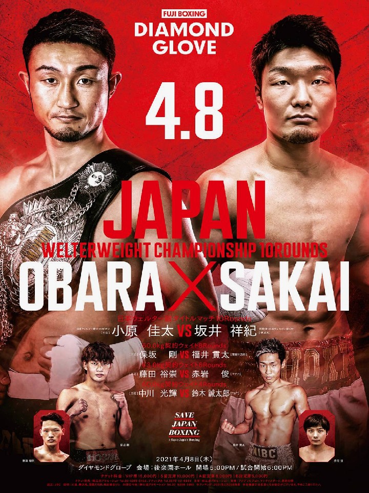 世界を目指す小原の日本王座初防衛戦。小原は昨年2月に永野祐樹(帝拳)に7回TKO勝ちし日本王座2階級制覇を達成。実力者の永野に勝利し国内ウェルター級ナンバーワンを証明した。メキシコ逆輸入ボクサーの坂井は、昨年8月に日本ランカーの重田裕紀(ワタナベ)を撃破すると12月には小畑武尊(ダッシュ東保)に判定勝ちした。小原はロングレンジから繰り出される強烈なパンチで坂井の硬いガードをこじ開けたい。坂井は、接近戦でどれまでジャッジに攻勢をアピールできるか。約1年2ヶ月ぶりのリングにとなる小原の仕上がりに注目だ。