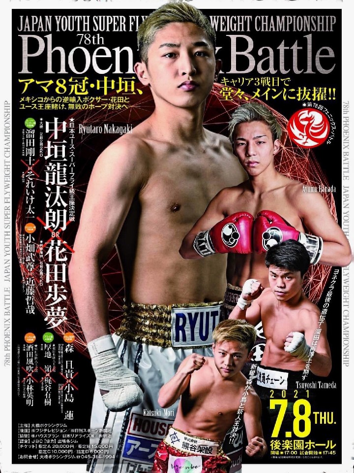 スーパーフライ級の東西ホープがユース王座をかけて激突する。アマチュア8冠を経てプロに転向した中垣は、サウスポースタイルから繰り出される多彩な攻撃とカウンターでここまで評判通りの実力を示している。一方、メキシコ逆輸入ボクサーの花田は、長身から繰り出される右カウンター、左ボディが光る。4月のマンモス和則(中日)戦ではタフな打ち合いを制した。初回からスリリングな攻防が繰り広げられそうだ。