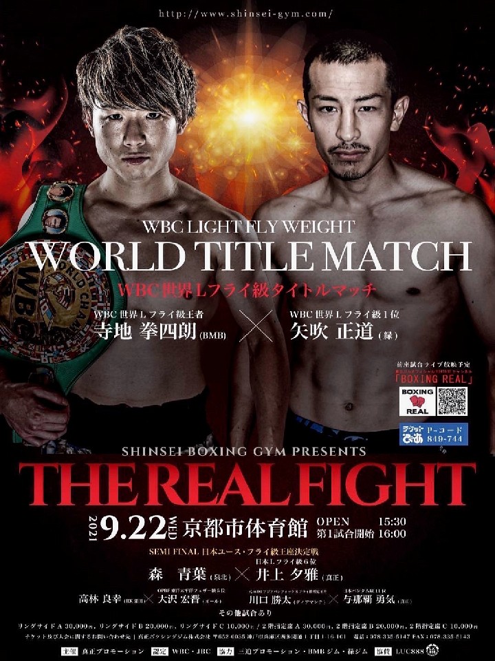 防衛ロードを突き進む拳四朗の9度目の防衛戦。拳四朗は、今年4月に久田哲也(ハラダ)に大差判定勝ちでV8を達成。抜群の距離感とテクニックを見せてベテランチャレンジャーの高い壁となった。拳四朗が京都のリングに上がるのは、2015年12月以来、約5年10ヶ月ぶりとなる。地元のファンに強さを見せるつもりだ。世界初挑戦の矢吹は、昨年7月に日本王座を獲得すると同年12月に初防衛に成功。キレ味鋭いジャブと勝負どころを逃さない嗅覚で12勝中11KOと高いKO率を誇る。4月の拳四朗の試合をリングサイドで観戦し、対策に余念がない。この試合のキーポイントとなるパンチは"ジャブ"。どちらが得意の左でペースを握るのか!?京都のリングが熱い!