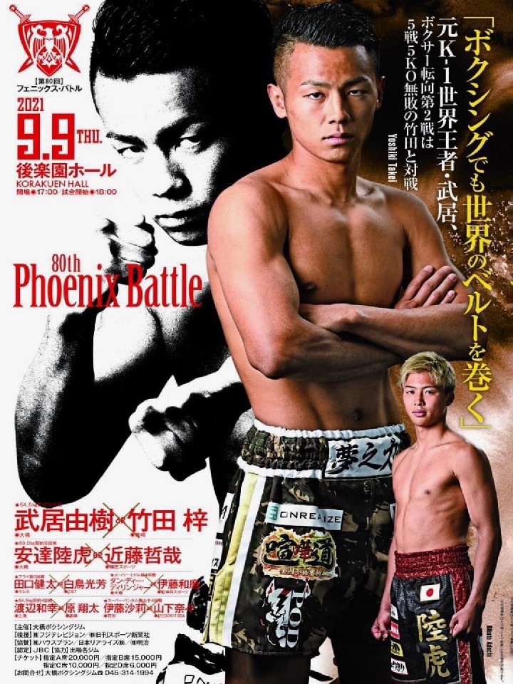 元K-1ワールドグランプリ王者武居のボクシング転向2戦目。今年3月のデビュー戦は、初回KO勝ちで強烈なインパクトを残した。元世界王者の八重樫東氏とのコンビでパンチに磨きをかけている。5戦全勝(5KO)の竹田は、左右ともに一撃で仕留めるパンチ力が魅力で、サウスポーも苦にしていない。両者とも好戦的なタイプでKO決着が濃厚だ。