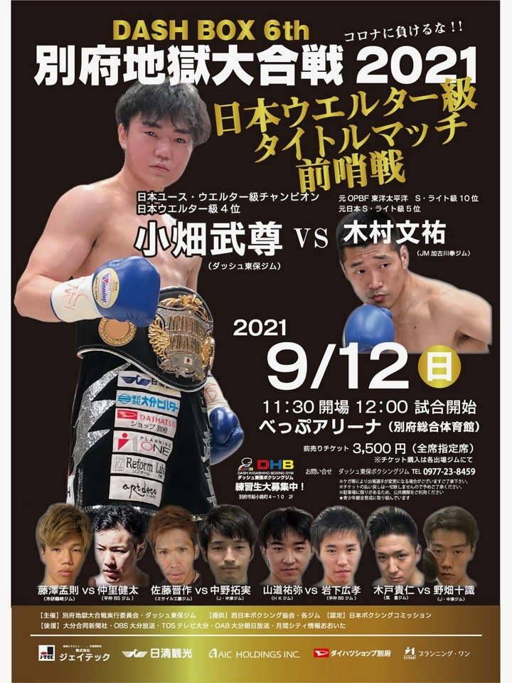 日本ユース王者の小畑が地元の別府で凱旋試合に臨む。今年3月に日本ユース王座を獲得した小畑は7月に無冠戦で近藤哲哉(横田スポーツ)に判定勝ち。多彩なコンビネーションでユース王者の力を示した。小畑が別府で試合をするのは3年ぶりだ。その時は負傷判定負けを喫しているため雪辱の思いも強いはず。元日本ランカーの木村は、ここ数戦は勝ち星から遠ざかっているが、敵地での試合経験が豊富だ。変則スタイルからのワイルドなパンチでランキング返り咲きを目指す。