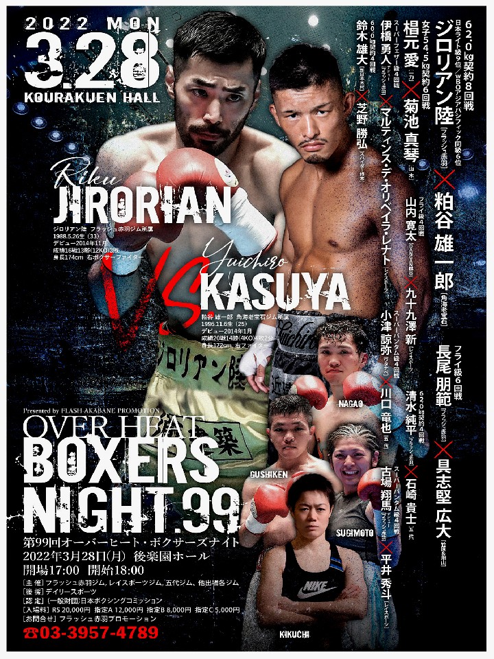 5連勝の日本ライト級9位のジロリアンは、左右ともに一撃で仕留める破壊力抜群のパンチ力が魅力。ここ3戦は序盤で決着をつけていてインパクトのあるKO勝ちを飾っている。元日本ランカーの粕谷は昨年9月以来の再起戦。距離を潰して豊富な手数で攻める激闘型。前戦は初のKO負けを喫したが打たれ強く、接戦を勝ち抜く勝負強さがある。ジロリアンがガツンと決めるのか?粕谷が後半勝負に持ち込み攻略するのか?この試合は間違いなく面白い!