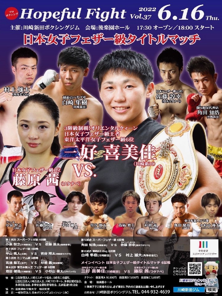 三好は、今年2月に若狭与志枝(花形)に判定勝ちし王座奪還に成功。これが初防衛戦となる。中間距離での攻防も打ち合いもできる万能型で、ここ数戦は巧みな試合運びを見せている。タイトル初挑戦の藤原は、約2年8ヶ月ぶりのリング。トップ選手が揃うワタナベジムで力をつけてきた。初回から積極的に仕掛けてリズムを作りたい。