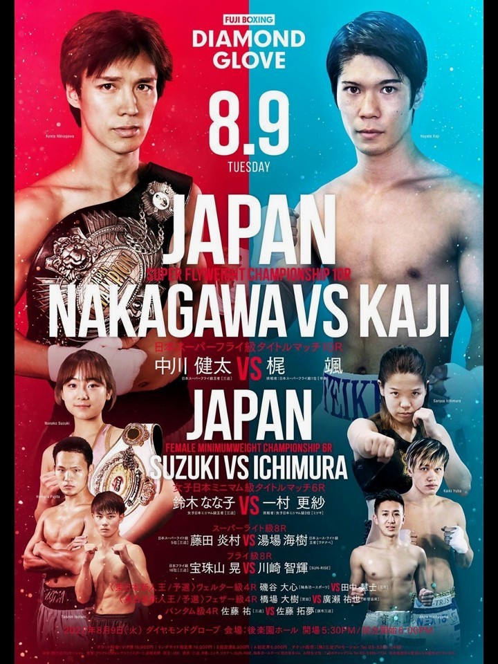 昨年3度目の日本チャンピオンに輝いた中川の初防衛戦。今年4月に久高寛之(仲里)との王座決定戦を制した。サウスポースタイルから右でコントロールしながら上下に打ち分けるテクニシャンで、円熟味を増している。これが2度目の王座挑戦の梶は、昨年10月に当時の王者の福永亮次(角海老宝石)に挑戦。右カウンターで福永を追い詰めるも接戦を落とした。梶が先に仕掛けて中川が迎え撃つ展開が予想される。最後まで目の離せないペース争いが繰り広げられそうだ。