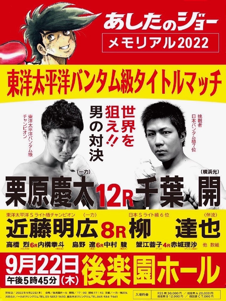 OPBF王者の栗原のV1戦。今年5月に元世界王者の小國以載(角海老宝石)とノンタイトル戦で対戦。4回負傷引き分けとなったが、ハイレベルな攻防を繰り広げた。2度目のタイトル挑戦の千葉は、ディフェンス力に長けた試合巧者だ。さらに進化を遂げた栗原の強打が爆発するのか?千葉が攻略するのか?