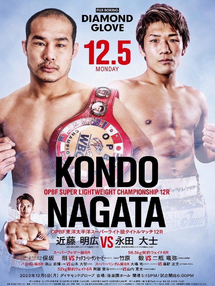 両者は2020年12月に日本王座を懸けて激突。7回負傷引き分けで、当時日本王者だった永田が防衛に成功した。立場を入れ替えてのリターンマッチ。V1戦に臨む近藤は9月に柳達也(伴流)とノンタイトル戦で対戦。挑戦者の永田は、今年5月に再起に成功した。前後に動きながら上下の打ち分けでリズムを作りたい。先に仕掛けることが予想される永田に対し、ベテラン近藤がどう対応するのか!?
